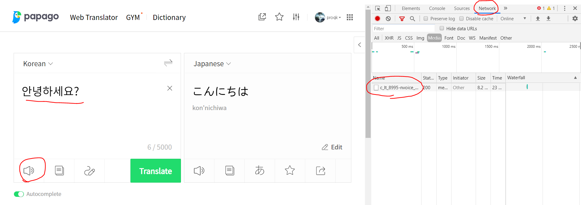 3. 크롬 기준 f12눌러서 개발자 모드->Network가면 오디오 파일 생성되어 있음