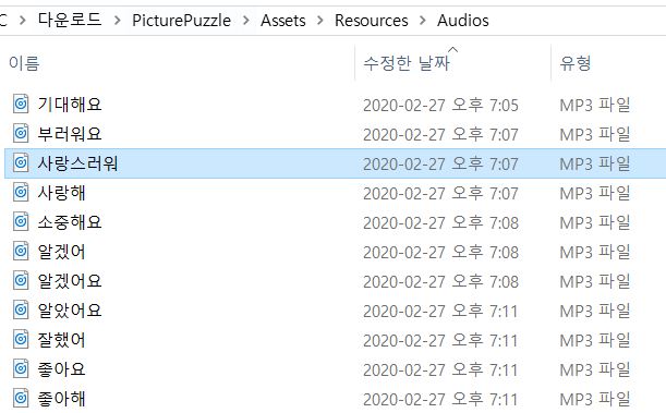 그렇게 뜯어낸 mp3 파일들을 전부 프로젝트 폴더/Resources에 새폴더 만들어서 넣어줬다