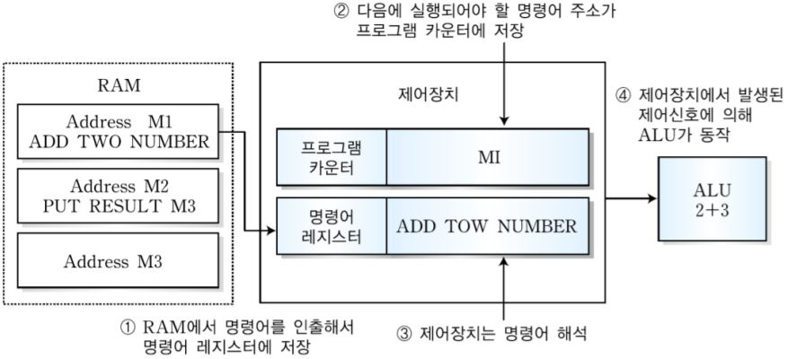 그림에서는 카운터의 현재 주소가 M1이기 때문에 RAM에서 M1에 해당하는 명령어가 명령어 레지스터에 들어갔다