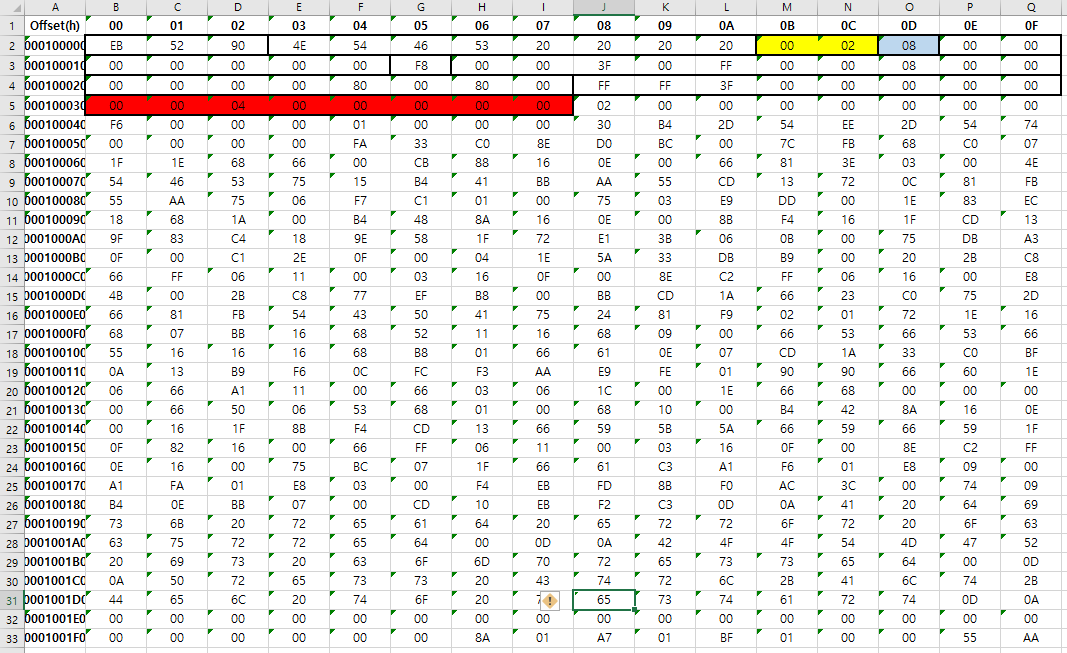 더 자세한 분석을 위해 2048번째 섹터의 512바이트 정보를 엑셀로 불러온다
