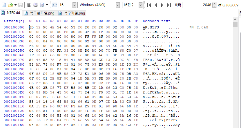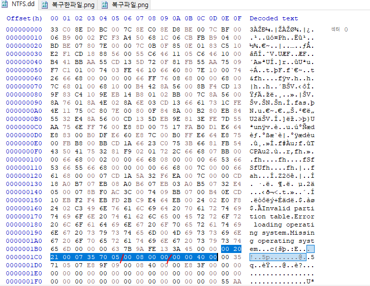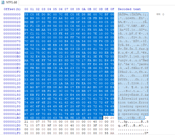 NTFS 디스크 이미지 파일을 열면 맨 처음 보이는 섹터에 저만큼이 MBR이다