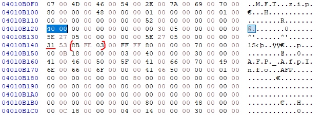 이제 사이즈를 알아야 하는데, 31 40 41 FE 03 앞에 있는 8바이트짜리 Initalized Size of Attr Content부분이 사이즈이다