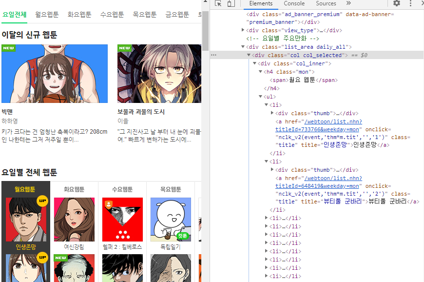 각 요일 별 전체 웹툰 정보는 div class="col_inner"에 li태그들로 묶여 있다