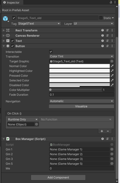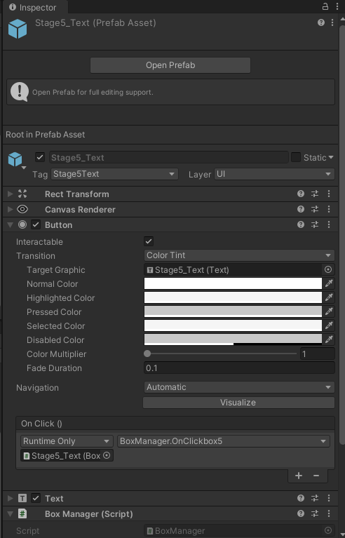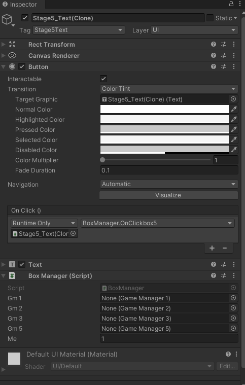 이 Prefab을 게임 실행 중 생성하고, On Click()에는 OnClickbox5() 함수를 넣어서, 클릭했을 때 이 함수가 실행되었으면 한다