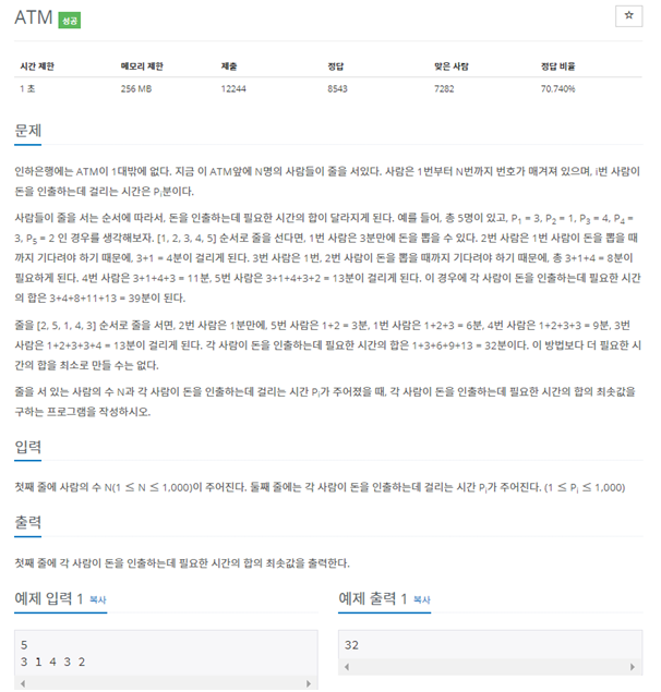 예시 문제를 풀어보겠습니다. ATM을 쓰기 위해서 사람들이 줄을 서 있습니다. 각 사람 별로 돈을 인출하는데 걸리는 시간이 주어졌을 때, 가장 빨리 모든 사람들이 돈을 뽑는 경우의 시간을 구하는 문제입니다.